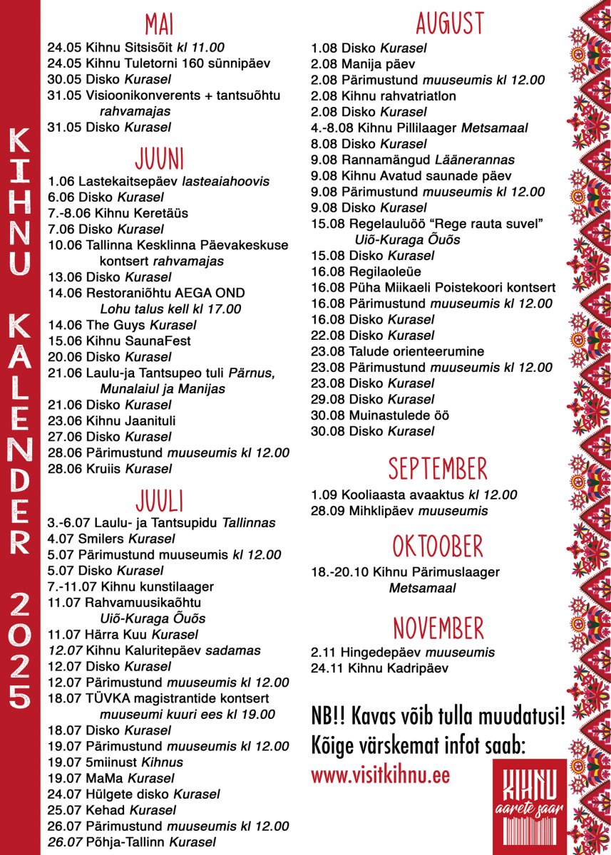 There are obviously more events in the summer and that is why it is a good idea to first look at the summer cultural calendar if you are planning a trip to Kihnu. Some bigger festivals and parties take place annually and can be discovered more HERE.